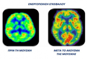 Χαρακτηριστικό παράδειγμα η απεικόνιση της ενεργοποίησης του εγκεφάλου πριν και κατά τη διάρκεια μουσικών ερεθισμάτων, όπως επίσης και η καταγραφή της δραστηριότητας των εγκεφαλικών κυμάτων σε κατάσταση στρες, και μετά από ακρόαση 15’ μουσικής.